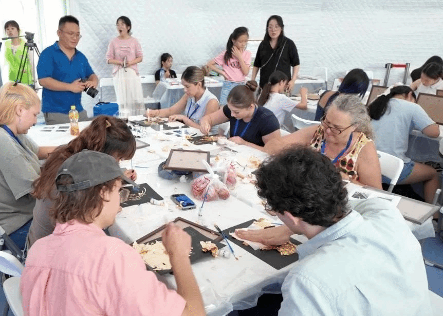 烧箔画课程由我校优秀研究生毕业生孙倩指导。作为一项源自唐代、兴盛于明清的千年非遗技艺,烧箔画以其独特的金属质感与绚丽色彩深深地吸引了学生们并深入体验了贴箔、烧色、錾刻等传统工艺。来自芝加哥的丽莎同学在完成作品后赞叹道:“金属箔片在火焰中变幻出的瑰丽色彩令人惊叹,这种将自然之美凝固在金属上的艺术形式,展现了中国传统工艺的独特智慧。”