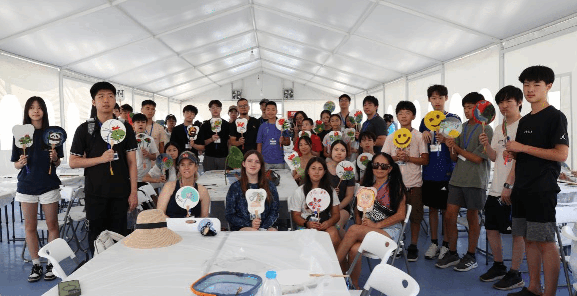 团扇绘画课由中国画高研班导师王少桓指导,带领中美学生体验简单有趣的荷叶绘画。学生们先用毛笔沾墨,学着画出荷叶的形状,再尝试用不同深浅的墨色表现叶片的质感。来自美国的索菲亚开心地展示她的作品:“虽然第一次拿毛笔,但跟着老师一步步画,没想到能画出这么好看的荷叶!”